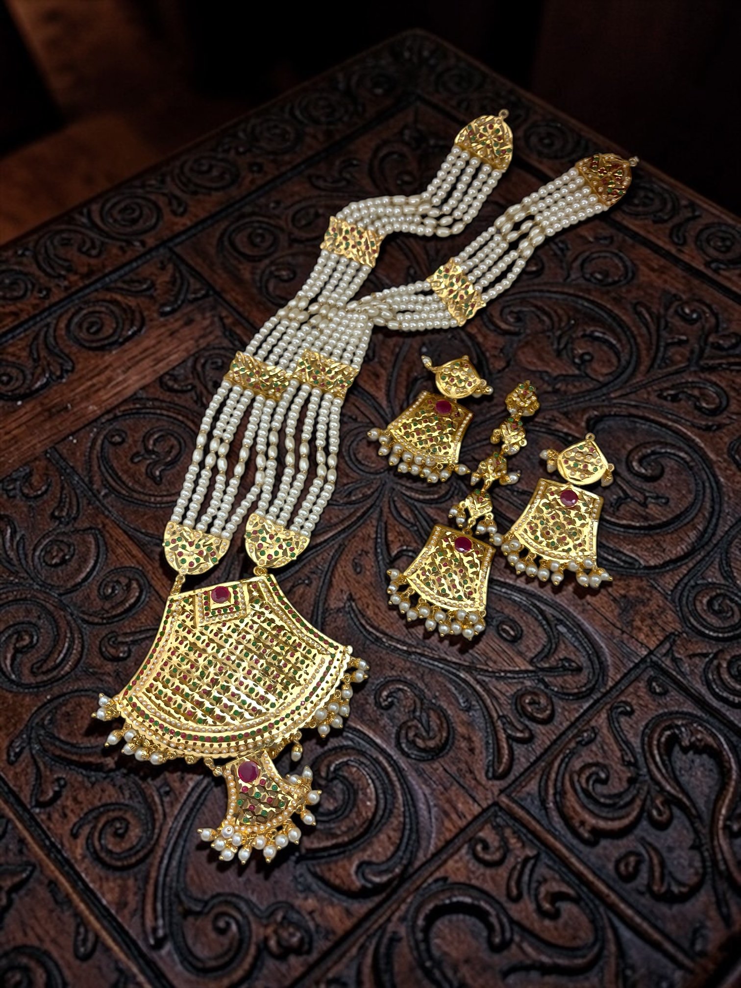 • Includes long necklace, matching earrings & maang tikka