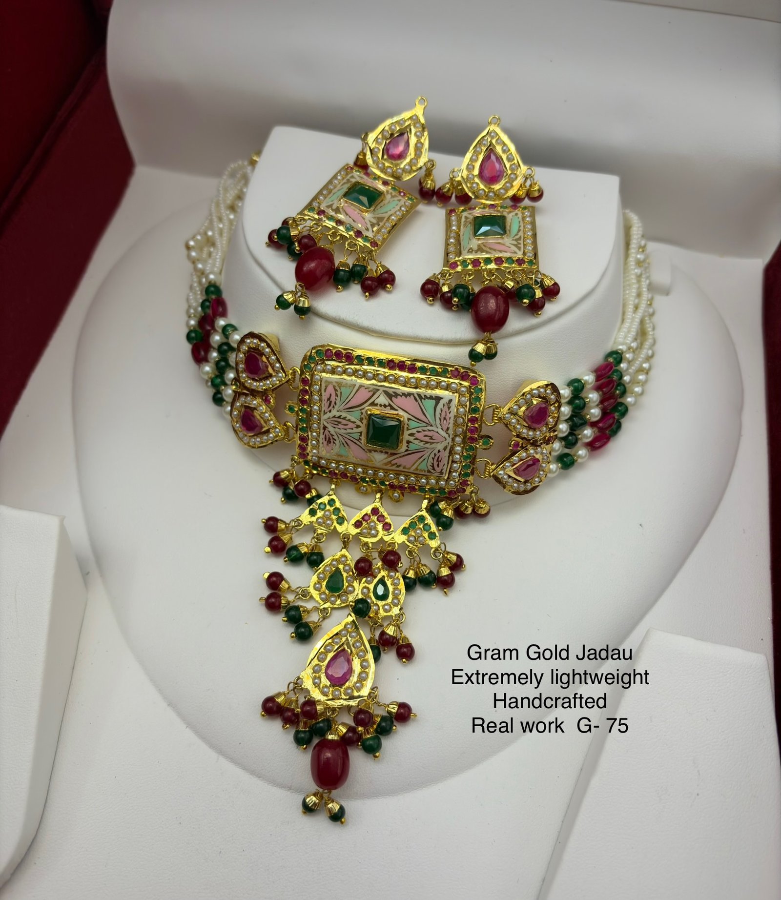 • Emerald and ruby style stone work is used to enhance the beauty of the set.
